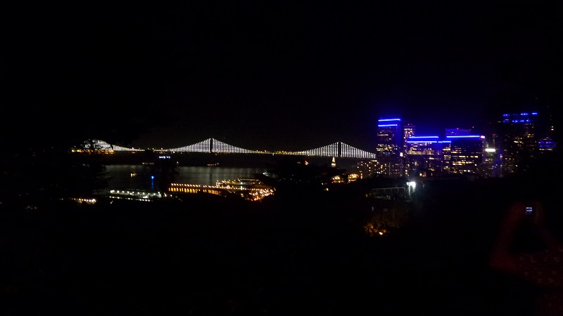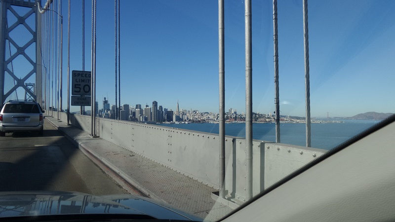 Heading across the Bay Bridge towards the city with Golden Gate to the right
